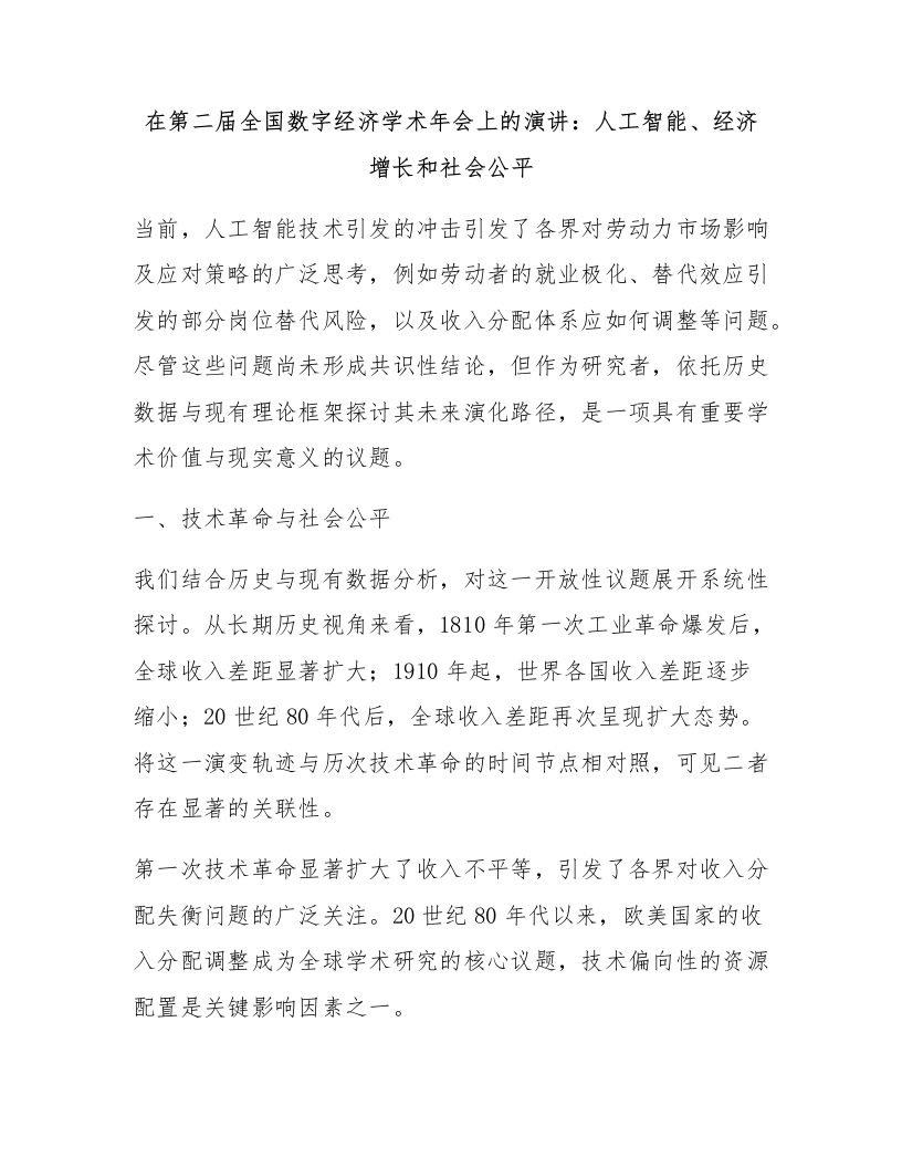 首页材料汇编综合材料在第二届全国数字经济学术年会上的演讲:人工智能、经济增长和社会公平