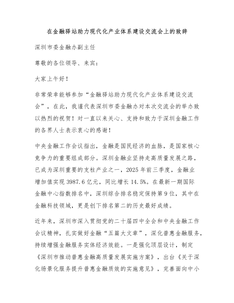 在金融驿站助力现代化产业体系建设交流会上的致辞