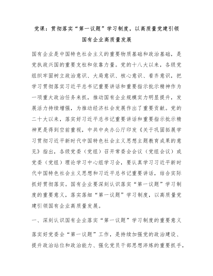 党课:贯彻落实“第一议题”学习制度,以高质量党建引领国有企业高质量发展