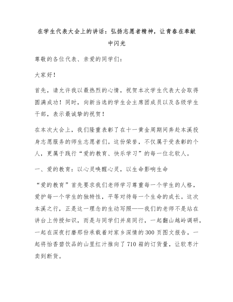 在学生代表大会上的讲话:弘扬志愿者精神,让青春在奉献中闪光