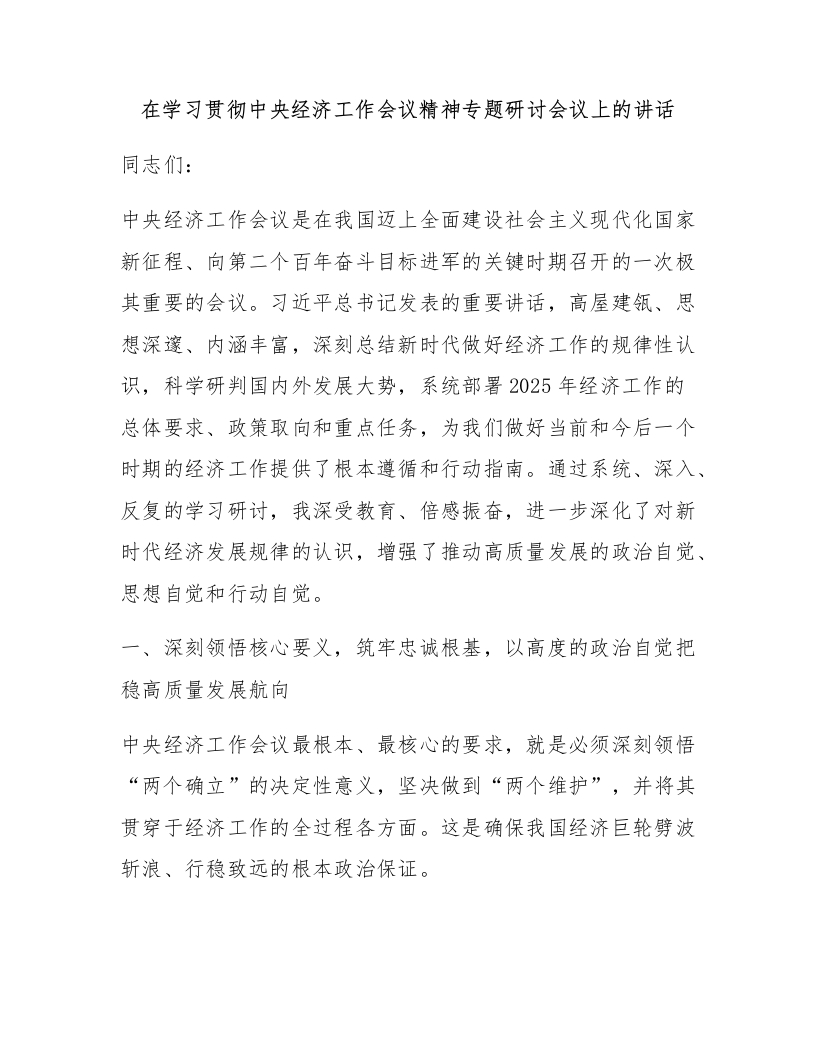 在学习贯彻中央经济工作会议精神专题研讨会议上的讲话