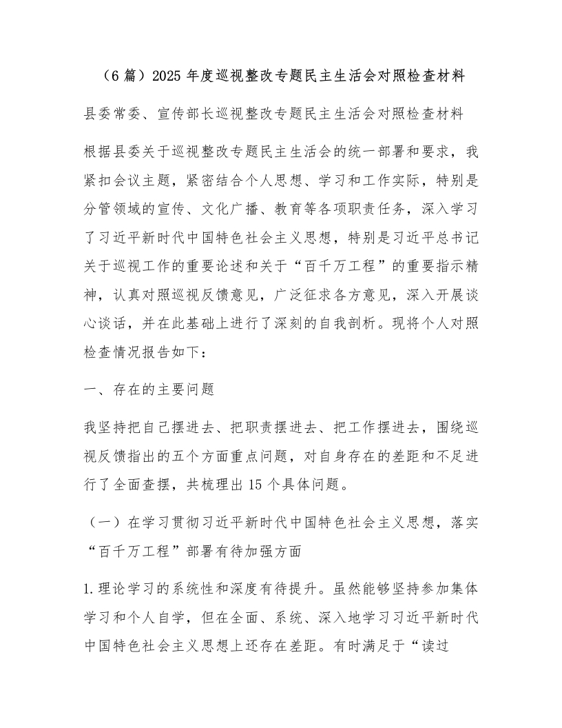 (6篇)2025年度巡视整改专题民主生活会对照检查材料