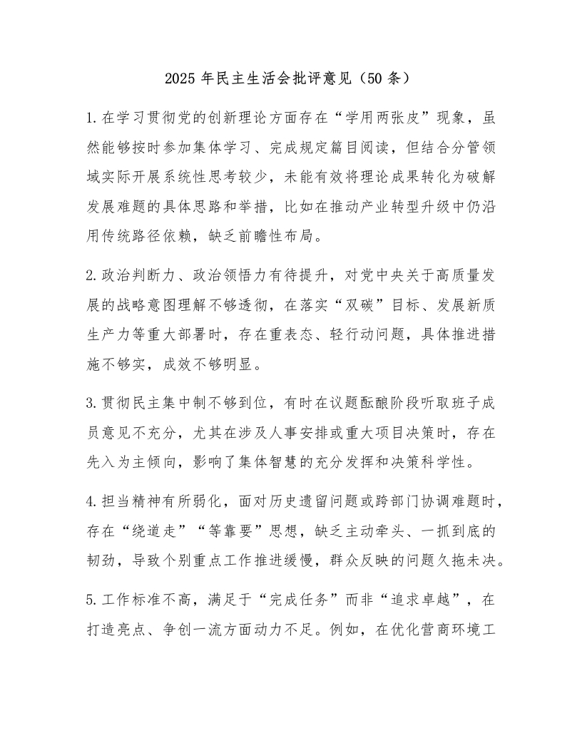 2025年民主生活会批评意见(50条)