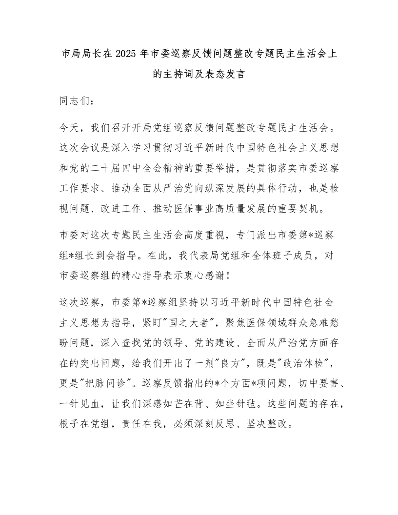 市局局长在2025年市委巡察反馈问题整改专题民主生活会上的主持词及表态发言