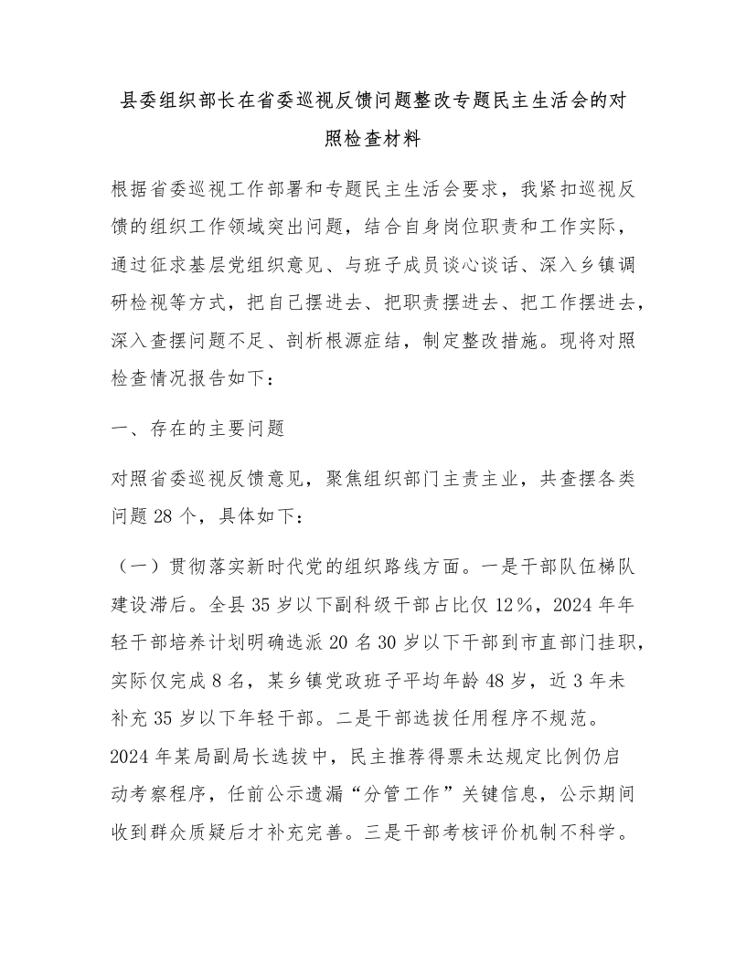 县委组织部长在省委巡视反馈问题整改专题民主生活会的对照检查材料