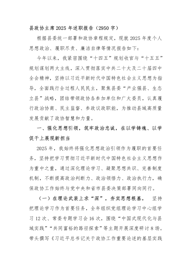 首页报告总结述职述廉县政协主席2025年述职报告(2950字)