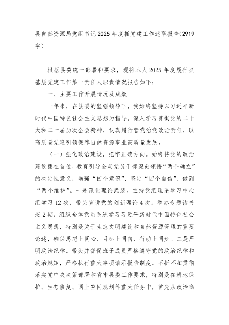 首页报告总结述职述廉县自然资源局党组书记2025年度抓党建工作述职报告(2919字)
