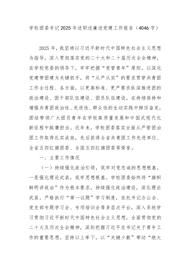 首页报告总结述职述廉学校团委书记2025年述职述廉述党建工作报告(4046字)