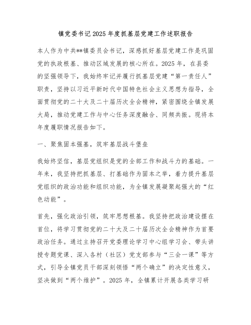 首页报告总结述职述廉镇党委书记2025年度抓基层党建工作述职报告